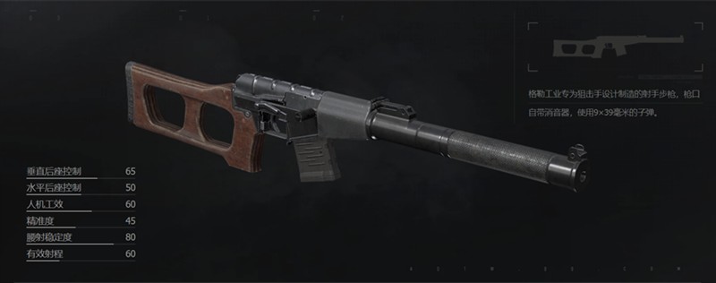 VSS采用半自动和全自动两种击发模式,配备转拴式枪栓和长行程气动式活塞系统。这把武器的初始弹匣容量为10发,使用9x39mm口径弹药,枪口初速达到287米/秒,理论射速高达850发/分钟。整枪重量为6.22公斤,在暗区突围中可以通过局内搜寻、市场购买、击败高级游荡者或联络人兑换等方式获取。