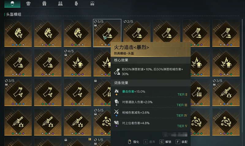 火力追击这个头盔模组以弹夹容量50%为分界点,前半段能提升射速,后半段则增加伤害。特别适合需要快速射击的流派,在PVE战斗中表现尤为突出。
