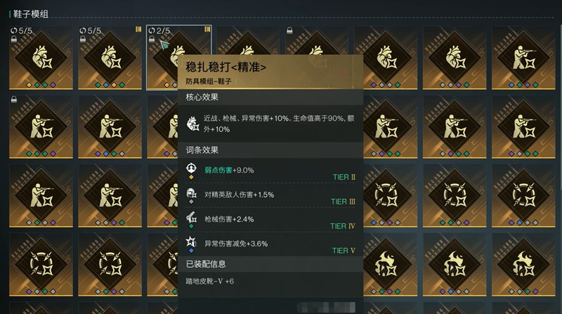 稳扎稳打是鞋子部位最通用的模组之一。基础提供10%三伤加成,当生命值保持在90%以上时还能额外获得10%三伤提升,是稳定增伤的优质选择。