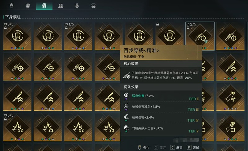 百步穿杨虽然触发条件较苛刻,需要命中弱点且保持一定距离,但伤害提升幅度极大,是狙击枪玩家的首选模组之一。
