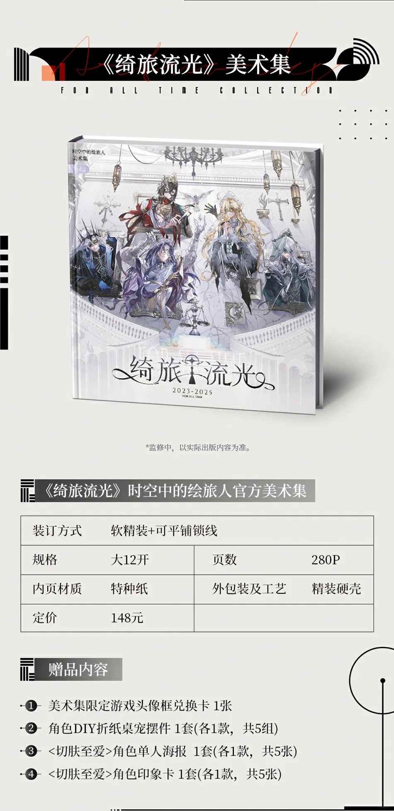 2025年7月21日12:00-8月21日23:59预售期间,购买《绮旅流光》美术集,可享受128元的优惠价格。《绮旅流光》美术集在寄出后,会根据余量或者加印的方式进行现货销售,届时将恢复原价售卖,具体上架时间请留意销售店铺详情。