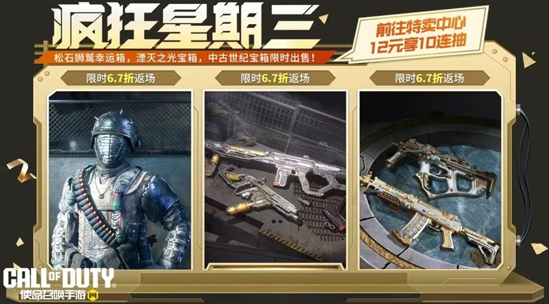疯狂星期三活动期间,战士们将享受6.7折的超值福利优惠。本次返场的三个宝箱各拥有一次特惠十连抽体验,战士们前往“特卖中心”,花费12软妹币即可十连抽一次!