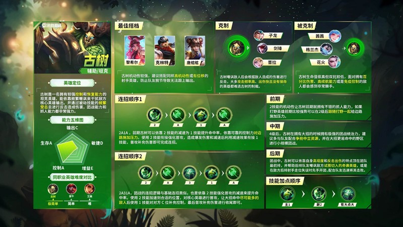 古树的定位是坦克和团控,他的技能组合让他在团战中能够轻松控制敌人,为队友创造输出机会。他的生存能力极强,能够承受大量伤害,同时还能通过嘲讽和减速效果控制敌人,为团队提供稳定的控制能力。