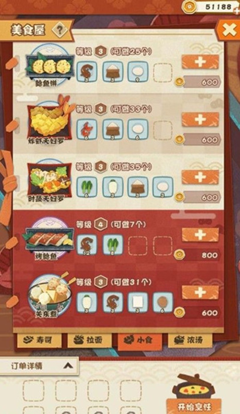 食谱和食材都有等级之分,等级越高需要的食材越多,但获得的经验值也更多。玩家可以通过挑战妖怪退治关卡来提升食谱等级。制作完成的美食要及时收取,放在灶台上是不会自动收入背包的。