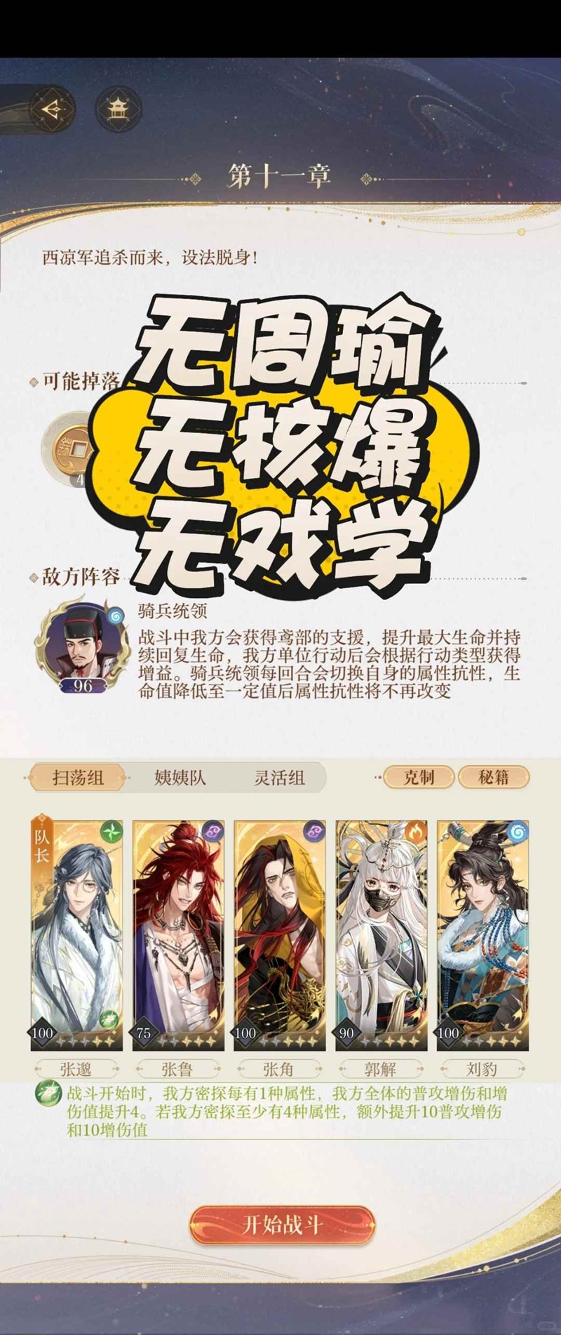 以上就是如鸢第十一章主线怎么过,11-20骑兵统领怎么打攻略的全部内容了,更多游戏资讯,攻略内容敬请关注切游网,您的支持是我们努力的动力!