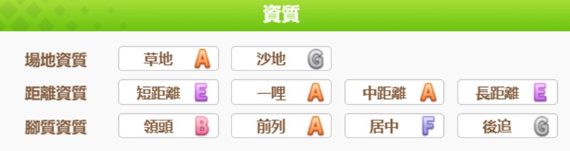 樱花千代王的场地适应性以草地为主,沙地表现较差。在距离方面,她最擅长一哩和中距离的比赛,训练时可以优先考虑这两个方向。跑法上她更适合保持前列或领头位置,一旦落后就很难再追赶上。这些资质特点决定了她在特定比赛中的优势。