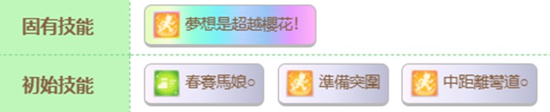 她的固有技能"梦想是超越樱花!"能在比赛最后300米通过追赶对手获得额外加速,这个技能在终点冲刺阶段非常实用。初始技能中,"春赛马娘"提升春季赛事表现,"准备突围"增强最后弯道的突破能力,"中距离弯道"则强化了弯道速度。