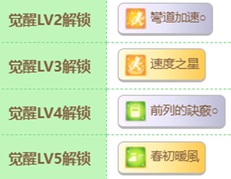 觉醒技能方面,弯道加速提供过弯时的速度加成,速度之星帮助在最后弯道保持领先,前列的诀窍提升前排位置稳定性,春初暖风则在春季赛事中增加速度和力量。这些技能组合使她在中距离比赛中具有明显优势。