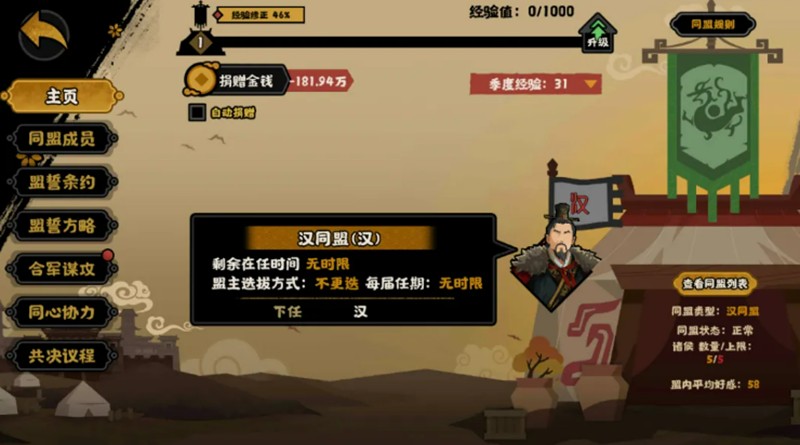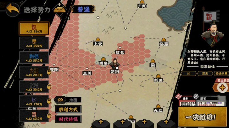 选择韩信将触发隐藏剧情"韩王天下"。韩信拥有灵活的外交特性,与汉结盟可获得兵权谋和山林移速加成,与楚结盟则能使用"背水一战"等强力技能。"多多益善"特性让韩信军团初始规模更大,钱粮消耗更低,适合持久战玩家。