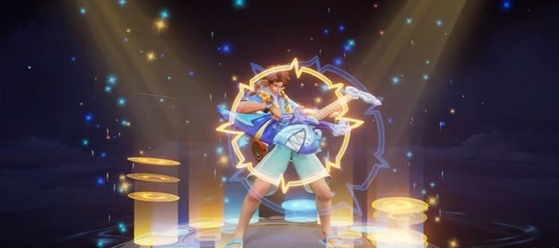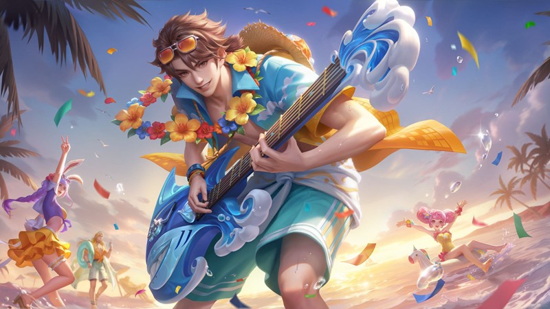 这款皮肤以轻松欢快、充满活力的夏日沙滩派对风格为基调,将音乐元素与夏日海滩场景完美融合,从发型到配饰,从颜色到服饰,再到武器设计,都充满了夏日的热情与惬意。在美宣图中,高渐离抱着特制的电吉他,在沙滩上轻快弹奏,周围还有公孙离、小乔、周瑜等英雄一同享受这惬意的夏日时光。