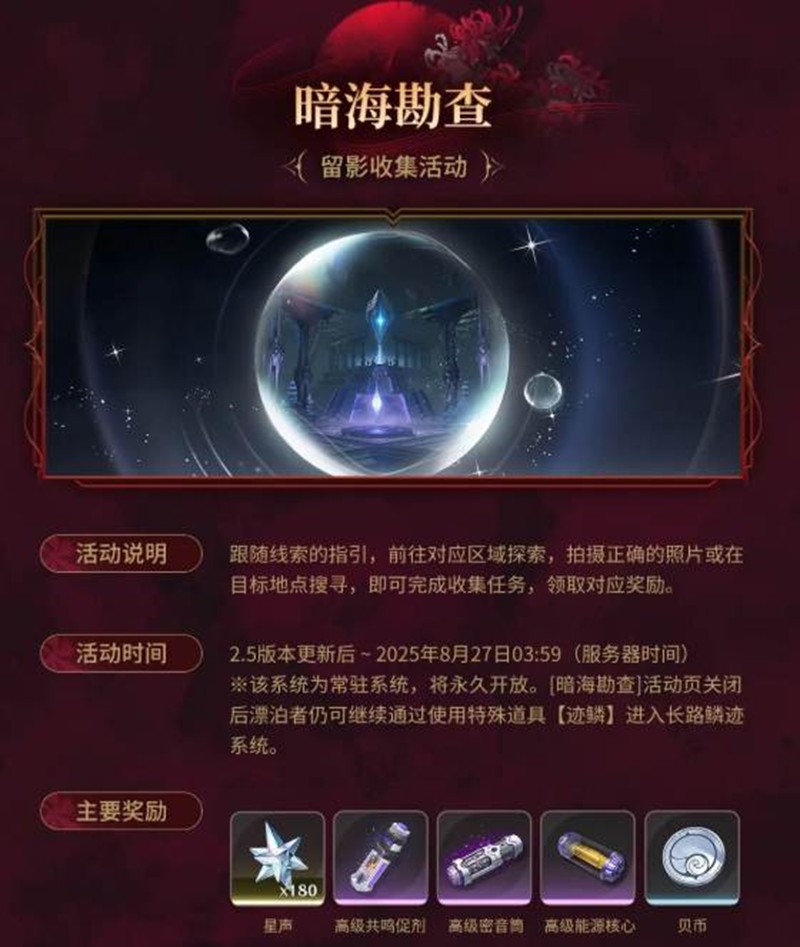 包括“幻梦游园”声骸乐园休闲体验、“暗海勘查”留影收集活动、“溢彩画册”休闲活动等。参与活动可获得“乐园幻梦”和“深梦电影节”等羁旅印章,以及丰富的星声和材料。