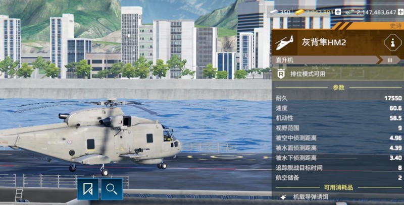 灰背隼虽然价格较高,但性能确实出众。这架直升机标配两架,装备两组机枪、两组魟鱼鱼雷和一组MK11无制导深弹。它既能有效反潜,又具备出色的自卫能力。AI操控下的灰背隼反应迅速,输出效率很高。
