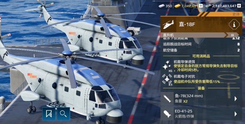 直18F携带鱼7鱼类和无制导深弹,单次可发射5轮鱼雷,火力相当可观。4轮深弹的伤害甚至超过5轮鱼雷的总和,让敌方潜艇难以招架。这架直升机在AI控制下表现积极,防御性能也很出色。
