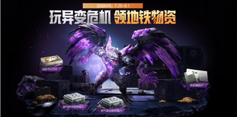 7月25日-8月1日,玩家参与异变危机玩法,根据造成的伤害获取弹药,在活动中消耗弹药对怪物造成伤害并最终击杀,根据玩家击杀怪物的进度,玩家可领取地铁币、绝密情报、欧气护甲物资箱和欧气背包物资箱奖励!