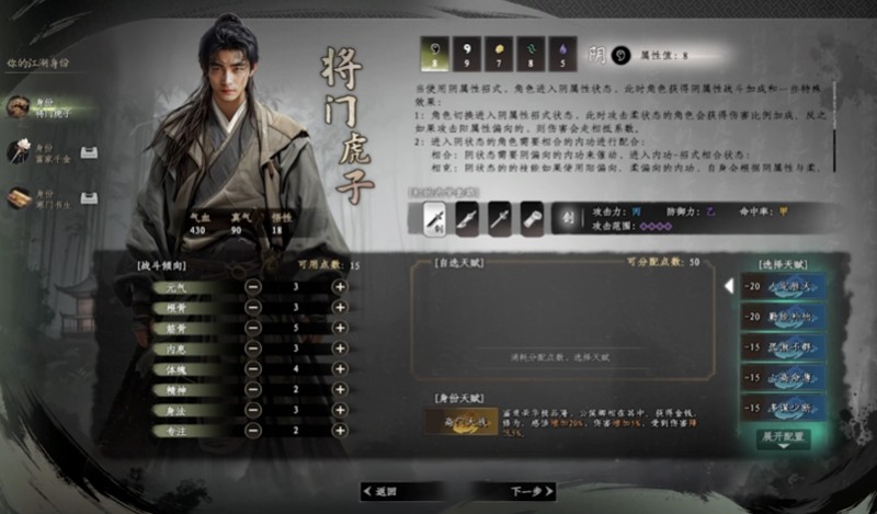 将门虎子这个身份适合喜欢战斗的玩家。作为名将之后,角色天生具备优秀的战斗天赋,初始就拥有扎实的武学基础和战斗能力。在剧情方面,玩家将深入体验家族恩怨和江湖纷争,经常需要参与各种战斗任务和门派事件。这个身份在资源获取上也有优势,完成侠义任务和江湖事件时能获得丰厚的武学秘籍和修为奖励。