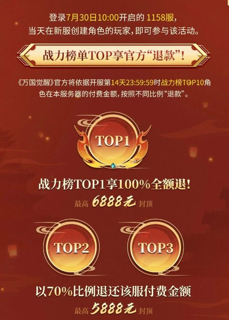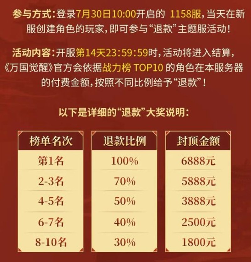 活动将根据开服第14天23:59:59时的战力榜排名,对排名前10的玩家进行不同比例的退款。