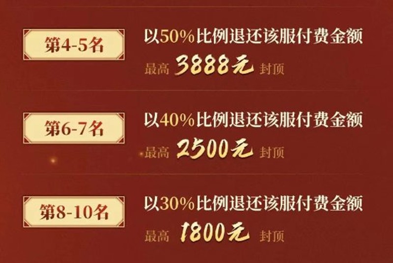 4.战力榜第4-5名:以40%比例退还该服付费金额,最高封顶金额为2500元。