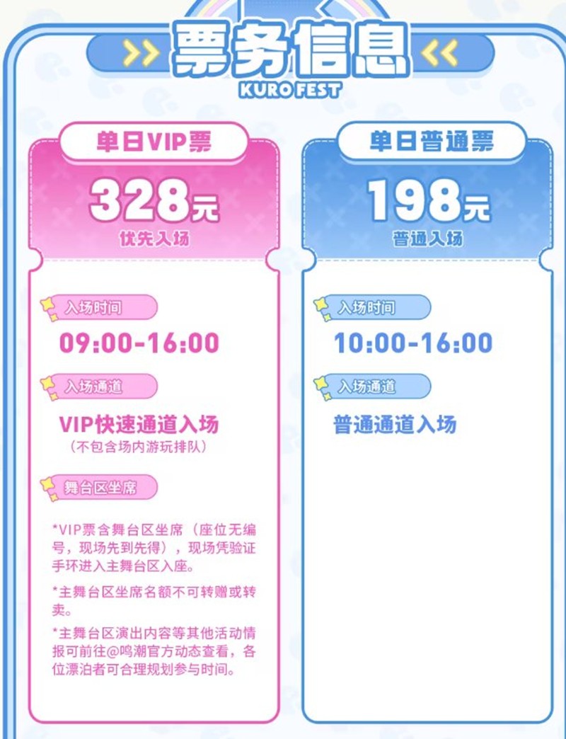 购票须知:活动不设现场售票,请在指定平台(bilibili会员购)上进行购票。每个会员账号UID最多可购入门票共2张,每个身份证每日可购买门票仅限1张。活动分为两种票档,分别为198元普通票及328元VIP票,两种门票对应不同的权益。个人信息填写完成并进入付款页面后,请在10分钟内完成支付,否则订单将被取消。参展人凭票可游览参与游戏馆《战双帕弥什》展区&《鸣潮》展区、综合馆全区域展位活动;舞台区座位仅面向VIP票开放。未满18周岁的未成年人、中国港澳台地区及其他国家、境外地区的参展人可持带有出生日期和本人照片的有效身份证件进行购买,包括:港澳居民来往内地通行证、台湾居民来往大陆通行证、护照、户口本。门票不得转售、转赠,切勿相信非官方购买链接以外的其他购买渠道,谨防上当受骗。