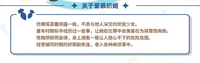 爱慕织姬的童年时期似乎经历过一些事,这让她在比赛中总是显得有些赎罪般的奔跑。她性格阴郁而自律,身上透着一股让人放心不下的危险氛围。尽管如此,她还是经常被同期的好歌剧牵连,卷入各种麻烦事中。