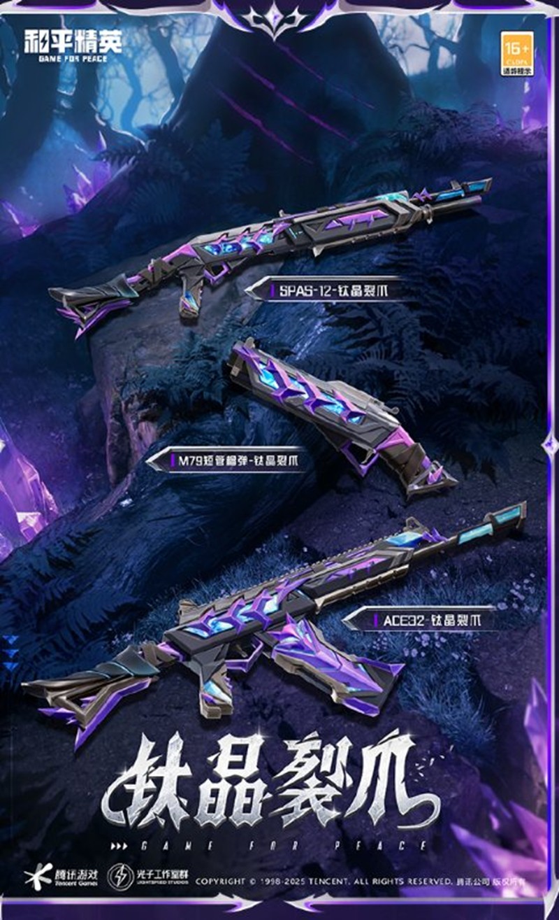 包括SFP9-12、M79短管霰弹枪和ACE32在内的多款枪械都将披上钛晶裂爪的外衣,展现出独特的紫色与水晶质感,让每一次射击都充满力量与美感。