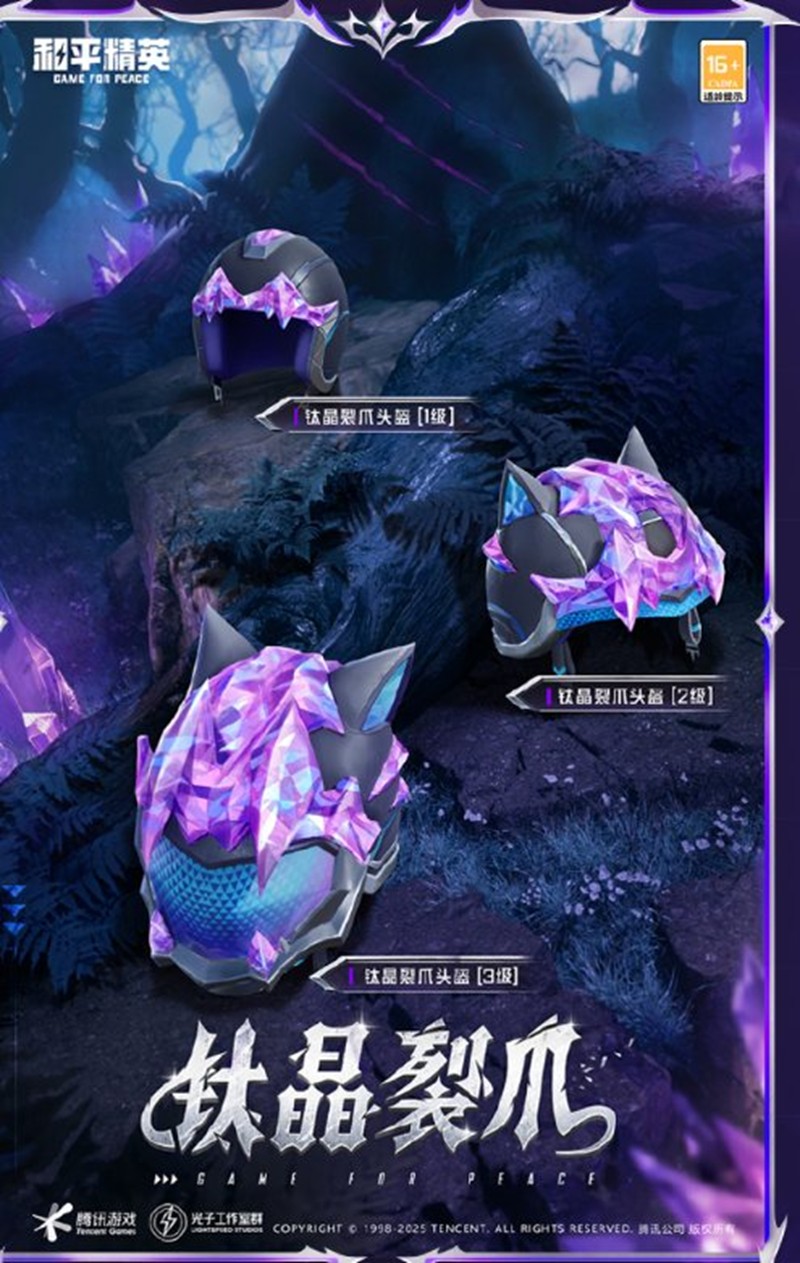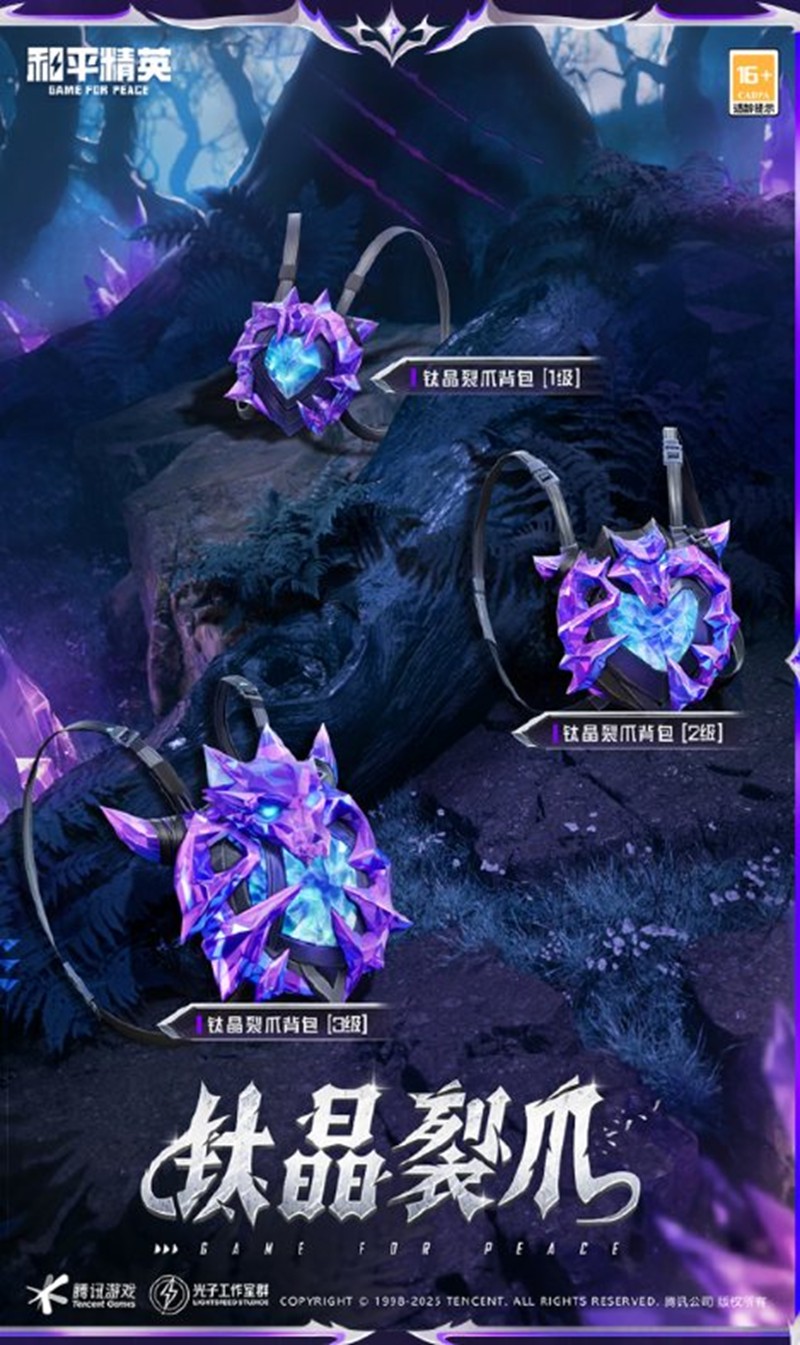 而钛晶裂爪头盔分为三个等级,每个等级都拥有独特的设计,从1级的简约到3级的华丽,逐步展现钛晶的神秘力量。背包同样分为三个等级,设计上与头盔相呼应,展现出完整的钛晶裂爪系列风格。