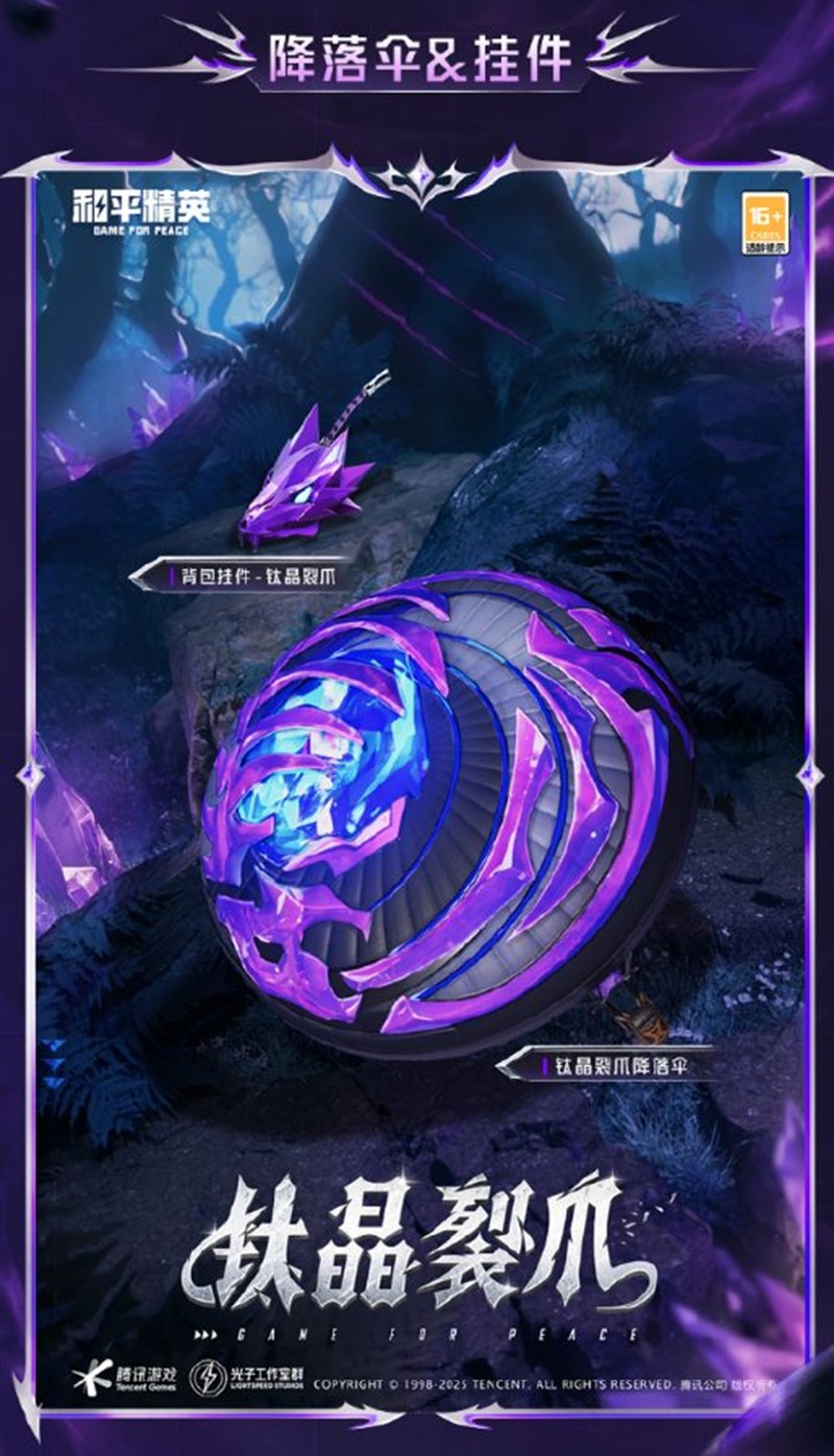 钛晶裂爪降落伞设计独特,紫色与水晶的结合让玩家在降落时成为战场上的焦点。