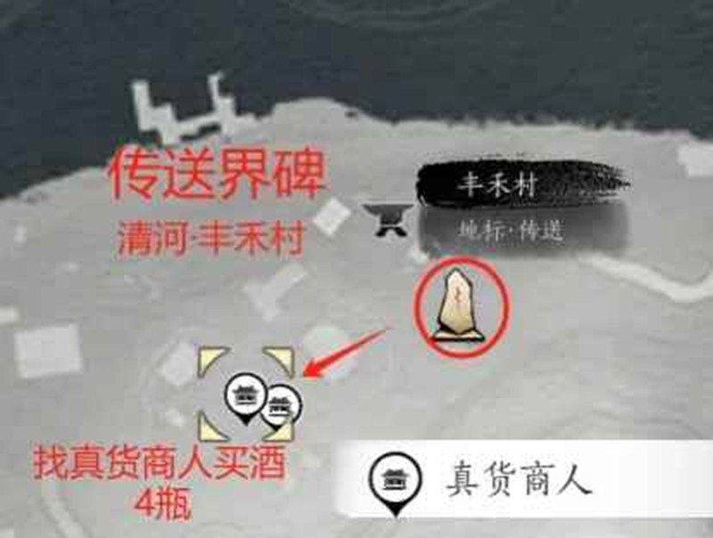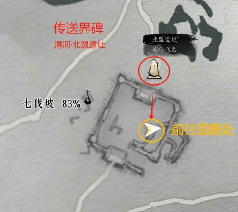 前往清河【北盟遗址】传送界碑图中所示触发任务且喝酒
