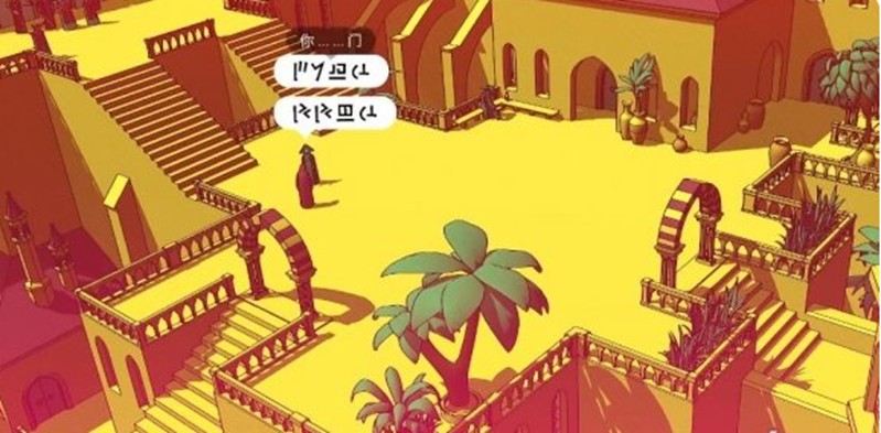 在通道中遇到壁画时,通过互动可以获取新的文字符号。来到广场中央与坐着的人对话后,继续前进可以与武士和信徒交流,这些互动都能解锁新的内容。返回广场后从左下角通道走,会触发一段交流剧情。通过小孩子打开的通道进入后,使用摇铃吸引注意力就能获得重要钥匙。