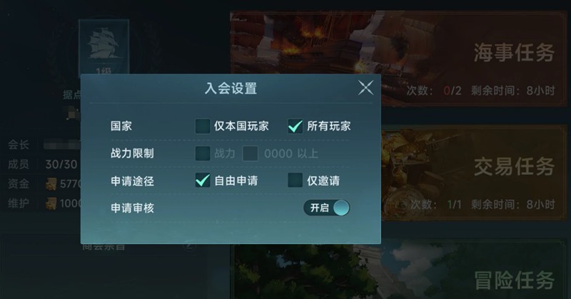 当航海家达到综合50级后,就可以在城市中找到商会管理员创建或加入商会。创建商会需要100万海币和一个独特的商会名称。加入商会时需要注意,不同商会有各自的入会条件,包括国籍限制、战力要求或需要邀请才能加入。通过游戏内的搜索功能,可以轻松找到心仪的商会。