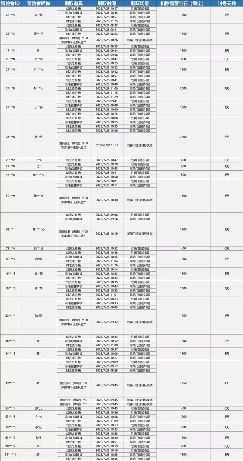 由于部分冒险者可能已将刷取的物资使用、交易或分解,故而开拓组将根据刷取资源总量,折算为蔷薇宝石(绑定),执行扣除操作,并根据服务器数据,进行时长不等的封号处罚。