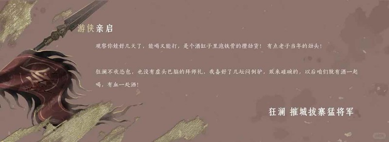 江湖虽大,知音难觅。若君亦是性情中人,嗜酒如命,狂放不羁,何不入我狂澜?山门已开,好酒已备,只待游侠凭帖入门。