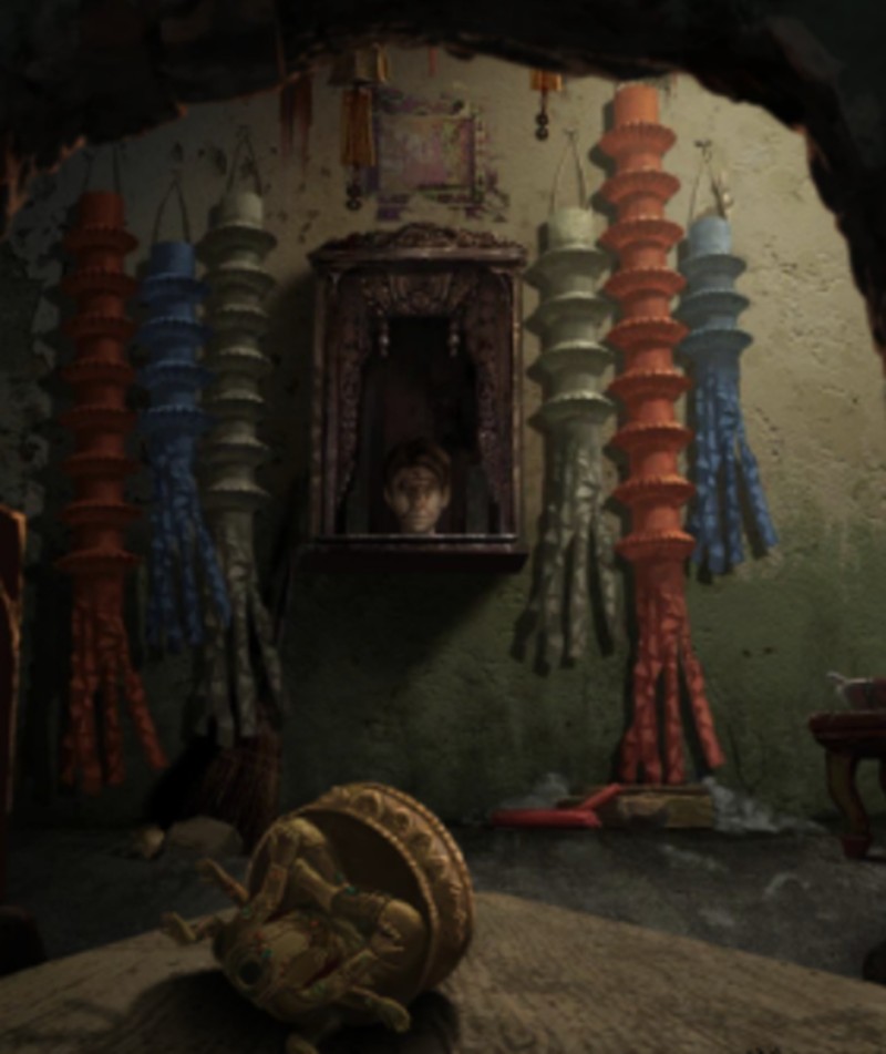 洞口旁的六葬菩萨像手中握有重要钥匙。玩家需要先用木板铺在洞口下方,再通过滑动屏幕投掷石块,最后点击菩萨像就能取得钥匙推进剧情。整个解谜过程充分展现了灵幡作为线索道具的关键作用。