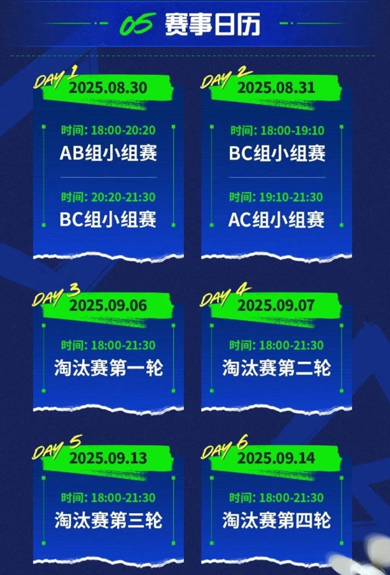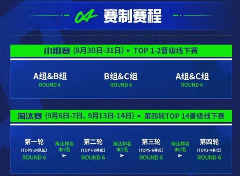 淘汰赛(9月6日-7日、9月13日-14日):第一轮(TOP9-24队伍):ROUND 6第二轮(TOP7-8补位):ROUND 6第三轮(TOP5-6补位):ROUND 6第四轮(TOP3-4补位):ROUND 6