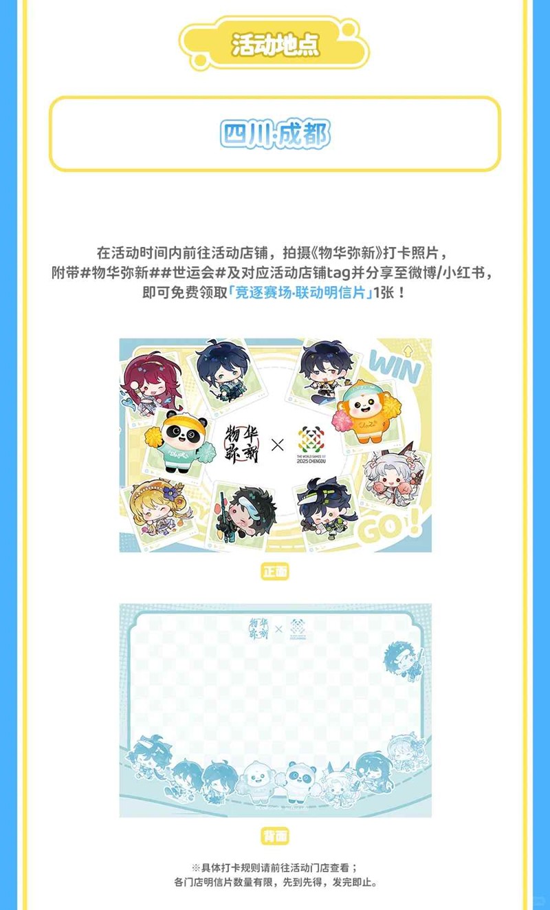 在7月30日至8月17日之间,前往活动门店,拍摄《物华弥新》打卡照片,附带#物华弥新 #世运会 及对应活动店铺tag并分享至对应平台,即可免费领取「竞逐赛场·联动明信片」1张!