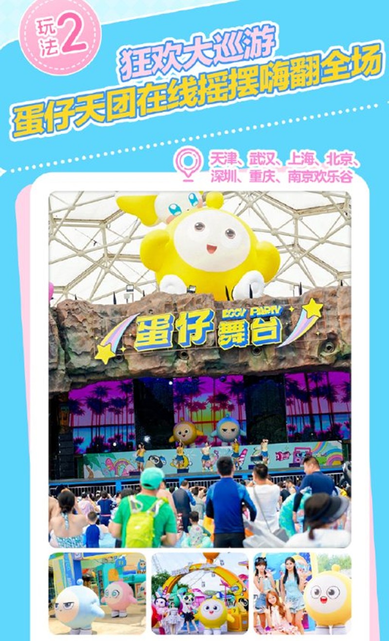 在天津、武汉、上海、北京、深圳、重庆、南京的欢乐谷,蛋仔天团将进行盛大的巡游表演。玩家可以跟随蛋仔一起摇摆,感受最纯粹的欢乐氛围。