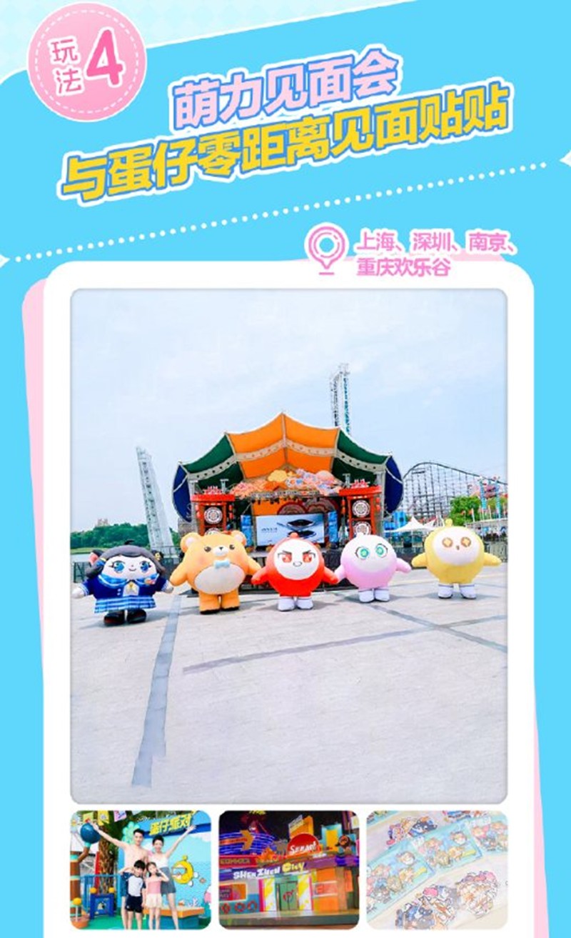 在上海、深圳、南京、重庆的欢乐谷,玩家有机会与蛋仔本尊亲密接触,求合照、求抱抱,心都要萌化啦!收获今夏最治愈的贴贴瞬间,血槽已空!