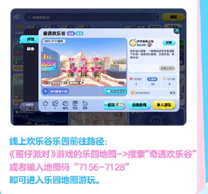 欢乐谷乐园地图也已上线《蛋仔派对》!足不出户,也能畅游七大欢乐谷乐园项目。线上欢乐谷乐园前往路径:《蛋仔派对》游戏的乐园地图->搜索“奇遇欢乐谷”或者输入地图码“7156-7128”即可进入乐园地图游玩。