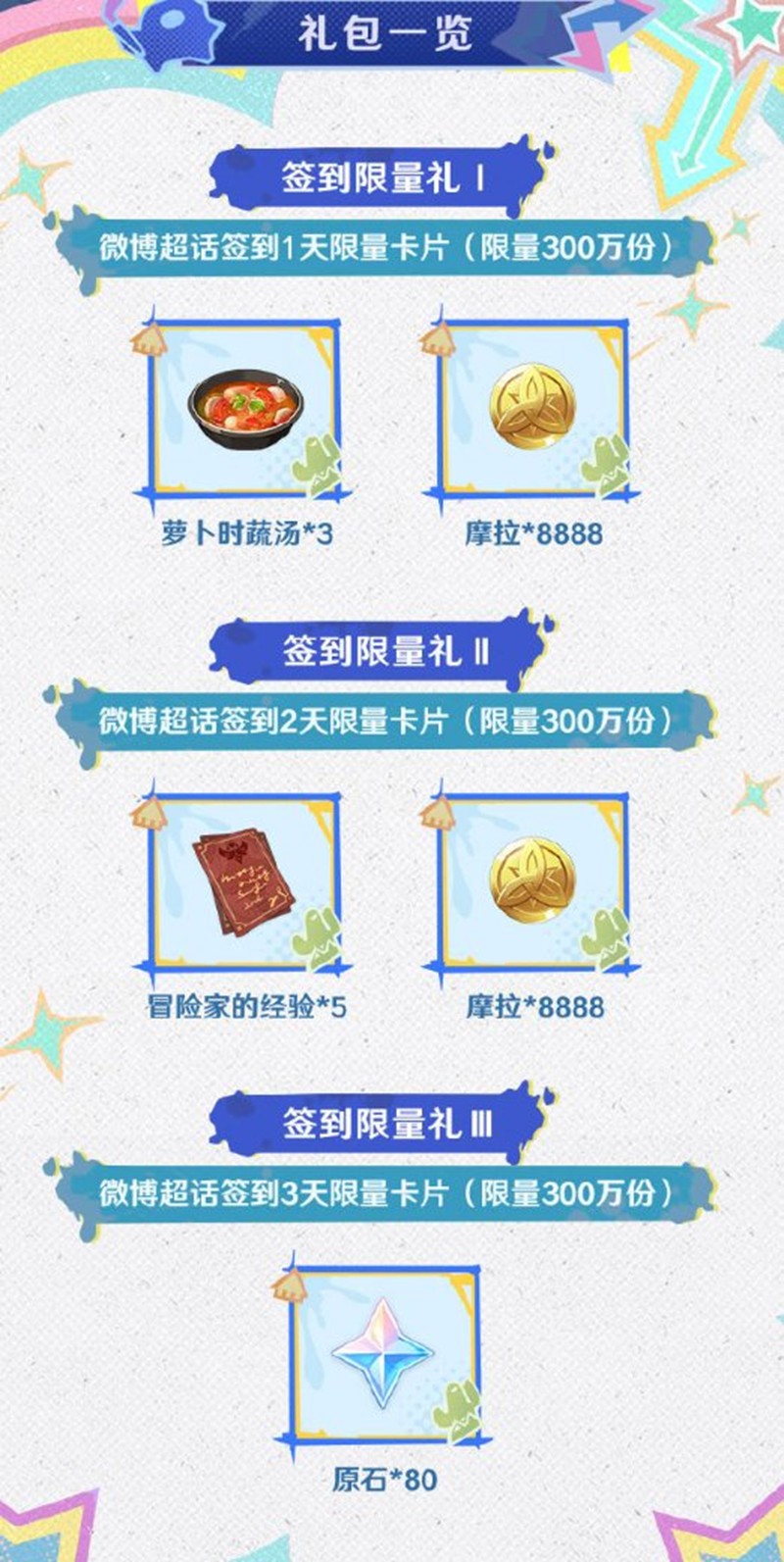 签到限量礼II(微博超话签到2天限量卡片,限量300万份)冒险家的经验*5摩拉*8888