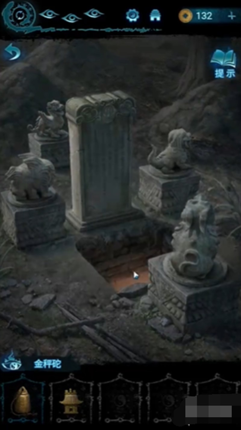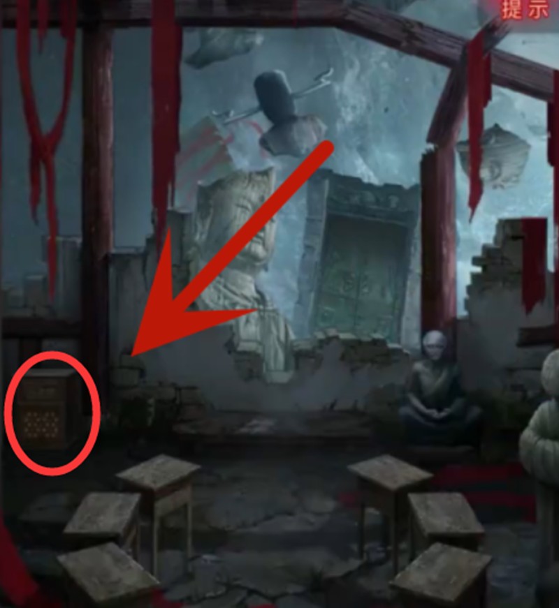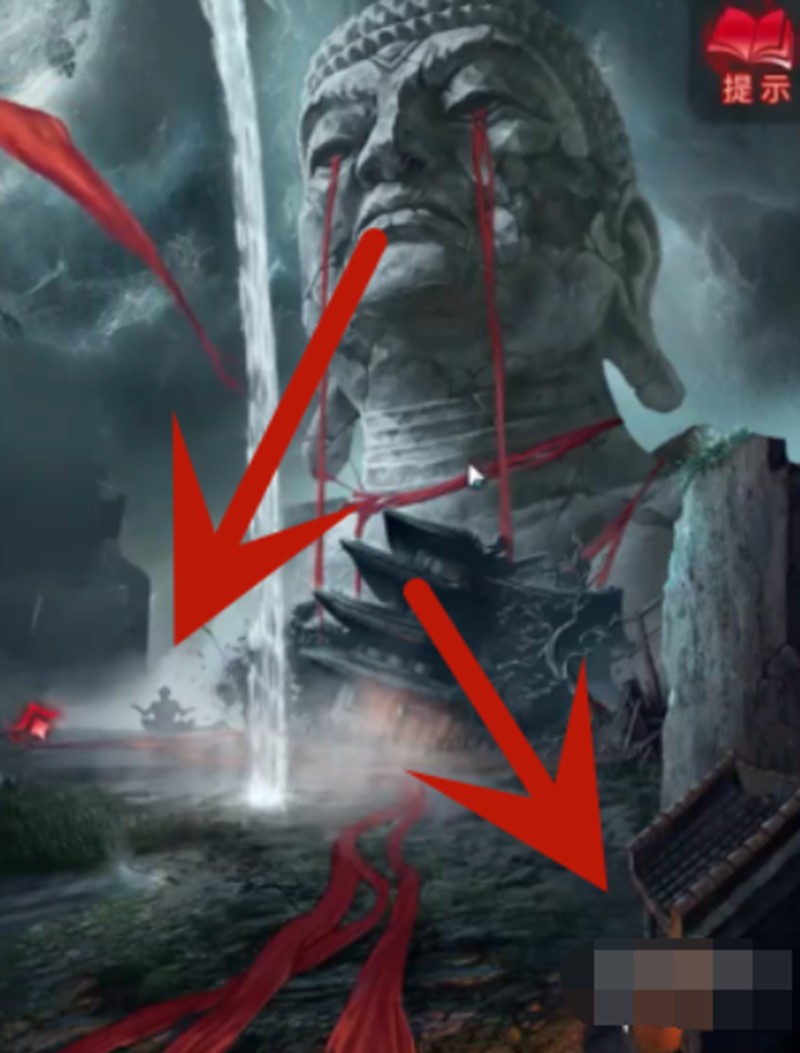 在初始场景点击佛像顶部触发剧情,右下角可拾取灵牌。左侧石像背后藏有重要线索纸条,水柱位置可切换至女主角视角。女主角在水中获得灵牌后需交给右侧石像,换取摇铃道具并查看石像前的提示信息。