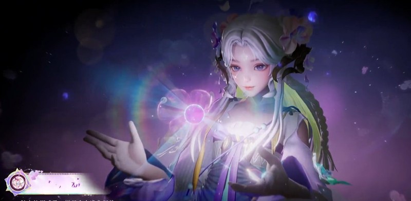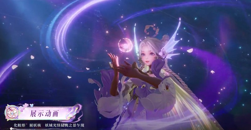 柔光透过紫色飞花,将妖域空间装点成绚烂的梦幻之境。鲛人畅游其中,能量如鲛绡般逐渐蔓延,将一切笼罩在温柔粉紫色氤氲的水域里,净化出一片澄澈清明的天地。