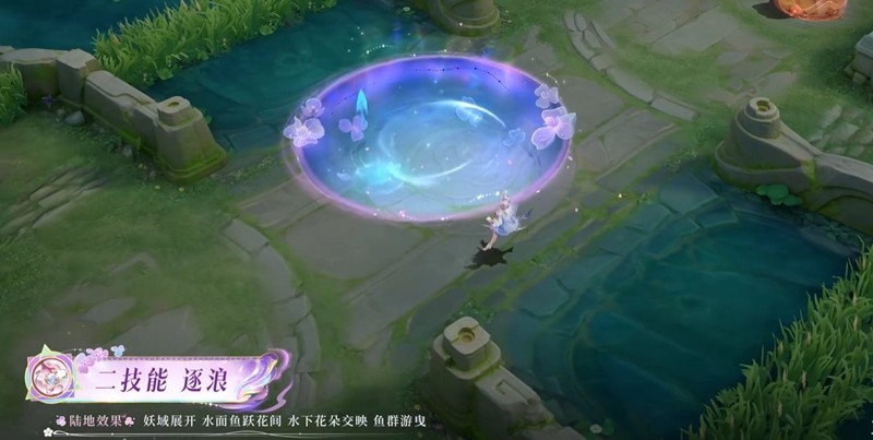 陆地效果:鲛人展开妖域,水面鱼跃花间,水下鱼群游曳穿梭于花朵间,虚实交映。