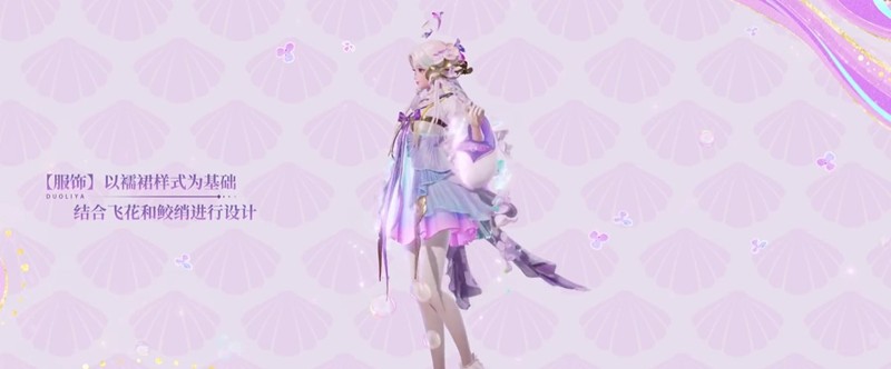 我们以鮫人泣珠的传说为主题灵感,将朵莉亚的气质特点与东方幻想式风格融合,及其故事中友人所赠的飞花元素进行了设计。