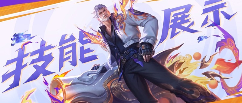 面具携火焰之力坠地形成持续燃烧的法阵,其中深紫色暗纹显现;命中敌人后在头顶产生燃烧的脸谱标记,并在橙紫色和蓝白色两种形态间不断变化,黄忠自身则被火焰护盾包裹;
