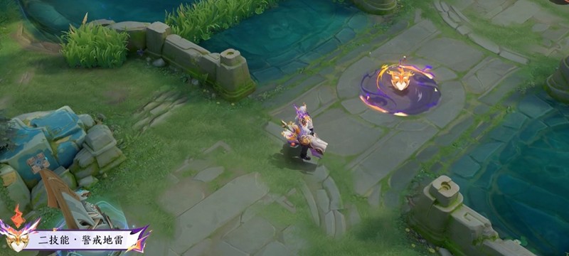 面具携火焰之力坠地形成持续燃烧的法阵,其中深紫色暗纹显现;命中敌人后在头顶产生燃烧的脸谱标记,并在橙紫色和蓝白色两种形态间不断变化,黄忠自身则被火焰护盾包裹;