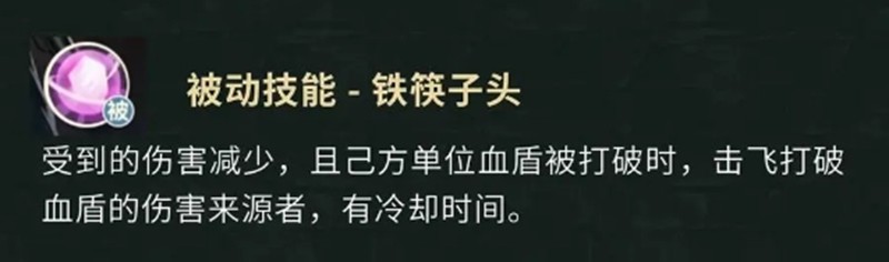 被动技能铁筷子头在吴三省成为敌方主要攻击目标时触发减伤效果。当敌方打破血盾时,还会受到反击被击飞,这个被动大大增强了吴三省的控制能力,能有效打乱敌方节奏。