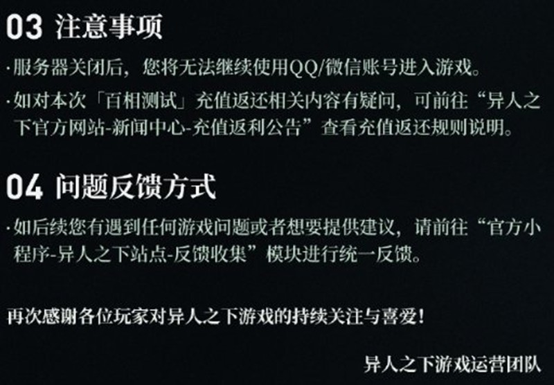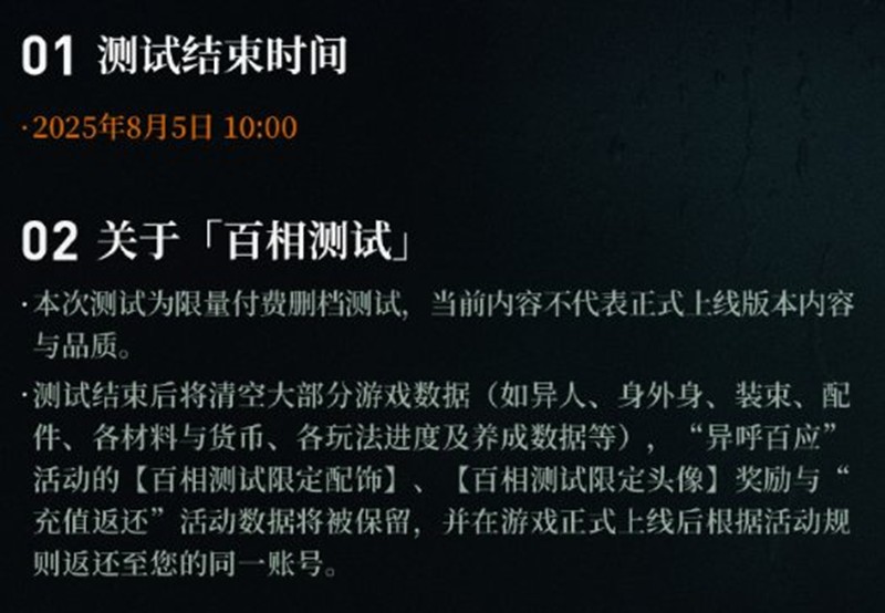 测试结束后将清空大部分游戏数据(如异人、身外身、装束、配件、各材料与货币、各玩法进度及养成数据等),但“异呼百应”活动的【百相测试限定配饰】、【百相测试限定头像】奖励与“充值返还”活动数据将被保留,并在游戏正式上线后根据活动规则返还至您的同一账号。