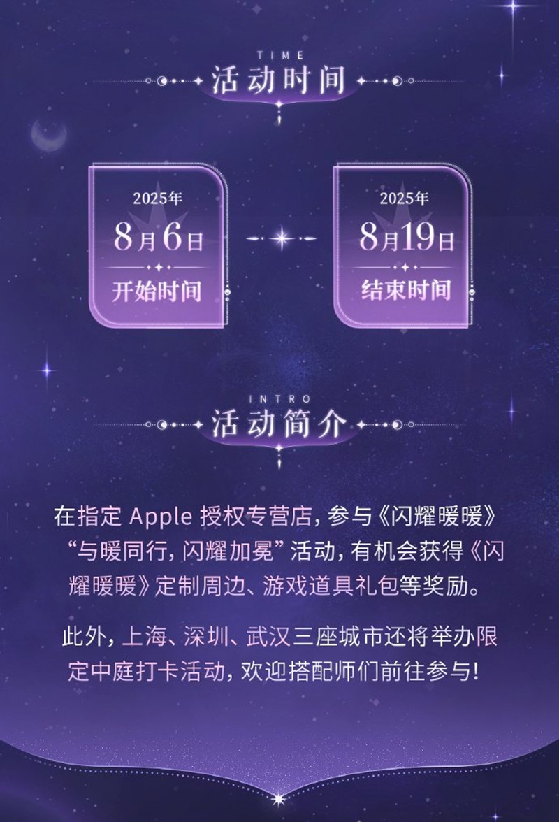 在指定Apple授权专营店,参与《闪耀暖暖》“与暖同行,闪耀加冕”活动,有机会获得《闪耀暖暖》定制周边、游戏道具礼包等奖励。此外,上海、深圳、武汉三座城市还将举办限定中庭打卡活动,欢迎搭配师们前往参与!