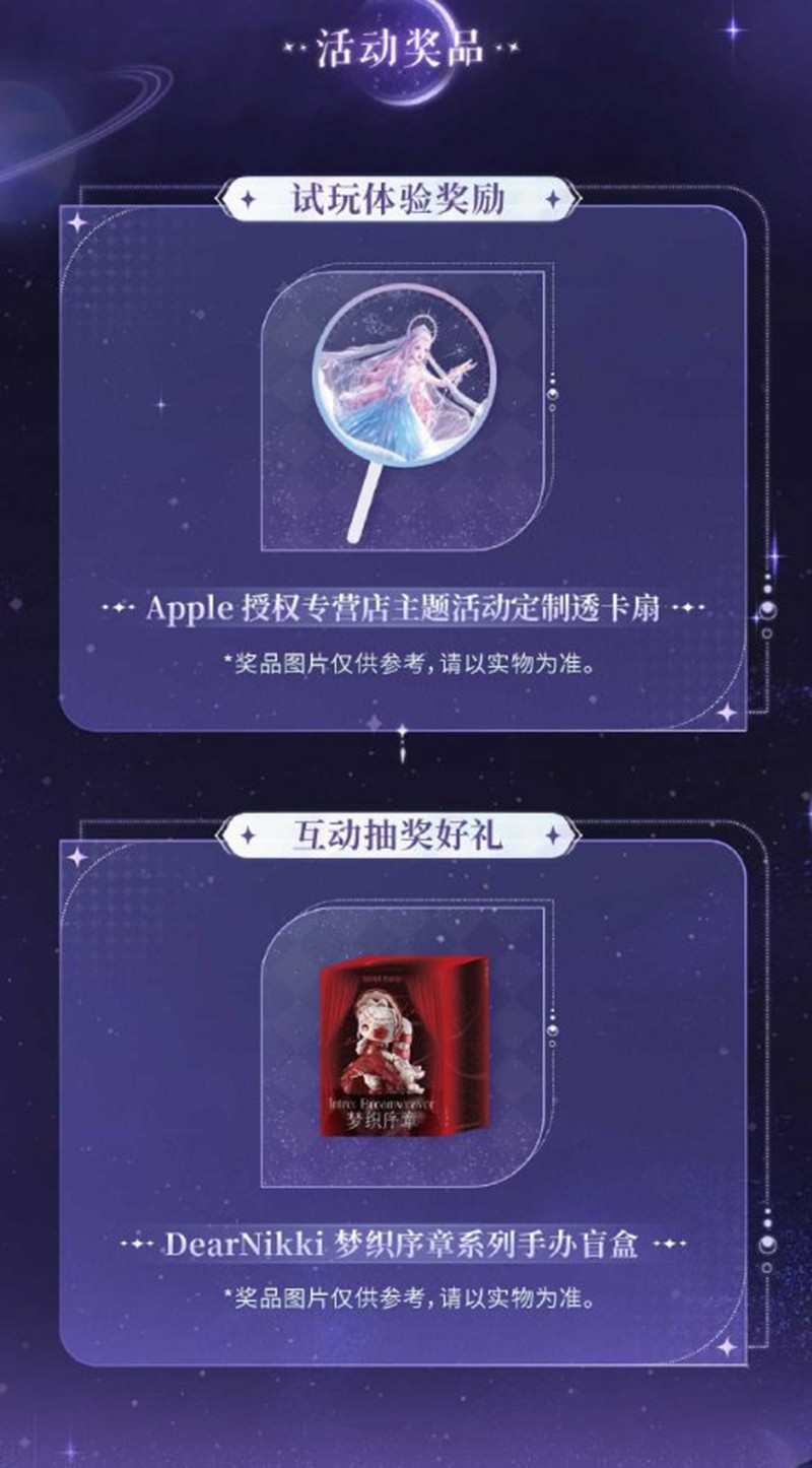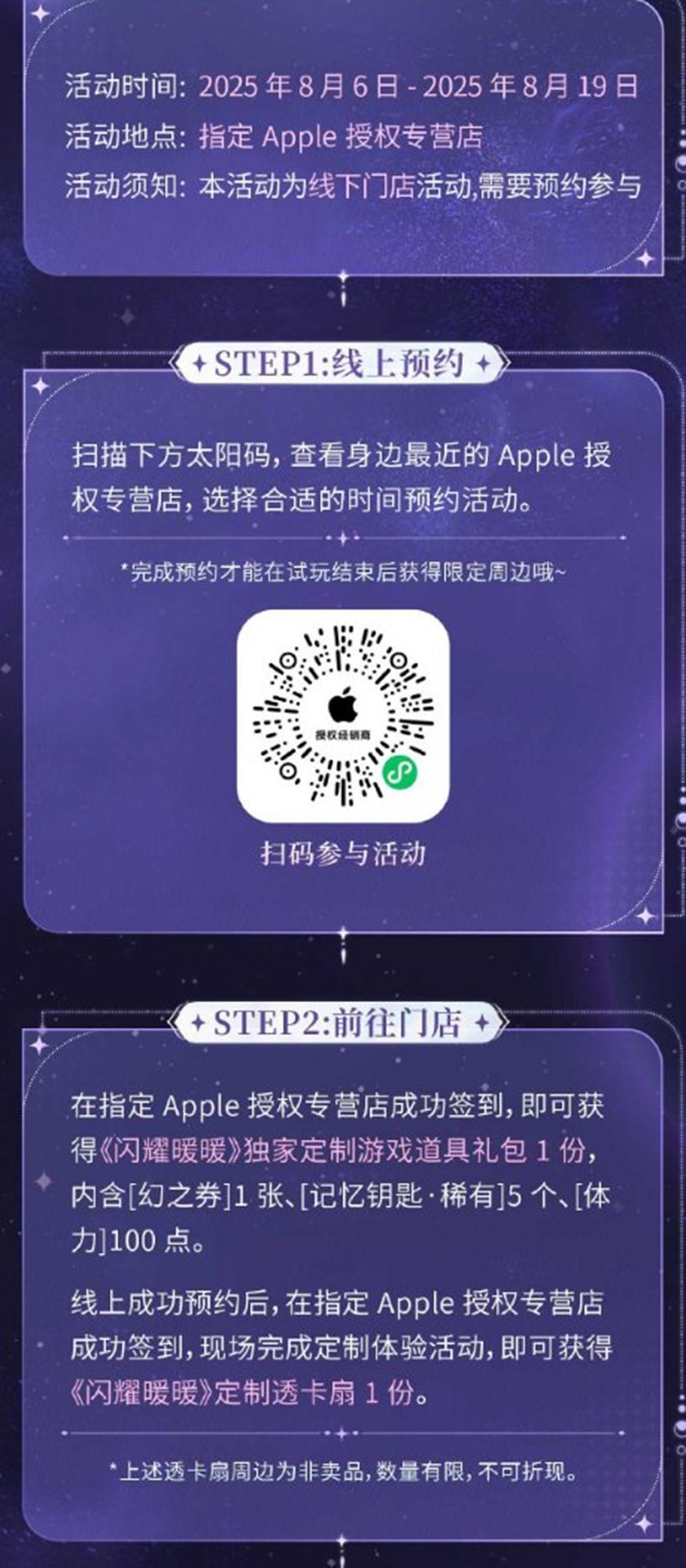 活动期间,线上成功预约后,在指定Apple授权专营店成功签到,现场完成定制体验活动,即可获得《闪耀暖暖》定制透卡扇1份。定制透卡扇共计30万份。活动期间,上述周边为非卖品,无市场销售价格,数量有限,不可折现。