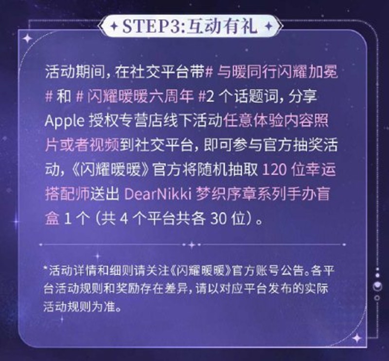 社交平台抽奖说明:活动期间,在社交平台带#与暖同行闪耀加冕#和#闪耀暖暖六周年#2个话题词,分享Apple授权专营店线下活动任意体验内容照片或者视频到社交平台,即可参与官方抽奖活动,《闪耀暖暖》官方将随机抽取120位幸运搭配师送出DearNikki梦织序章系列手办盲盒1个(共4个平台,各30位)。活动详情和细则请关注《闪耀暖暖》官方账号公告。各平台活动规则和奖励存在差异,请以对应平台发布的实际活动规则为准。