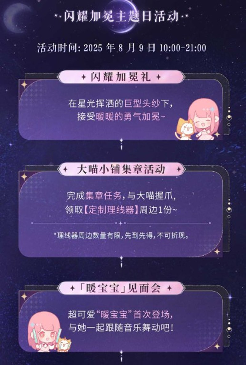 8月9日,参与主题日集章活动,可在现场【大喵小铺】领取活动专属【定制理线器】周边1份(共计9000份)。